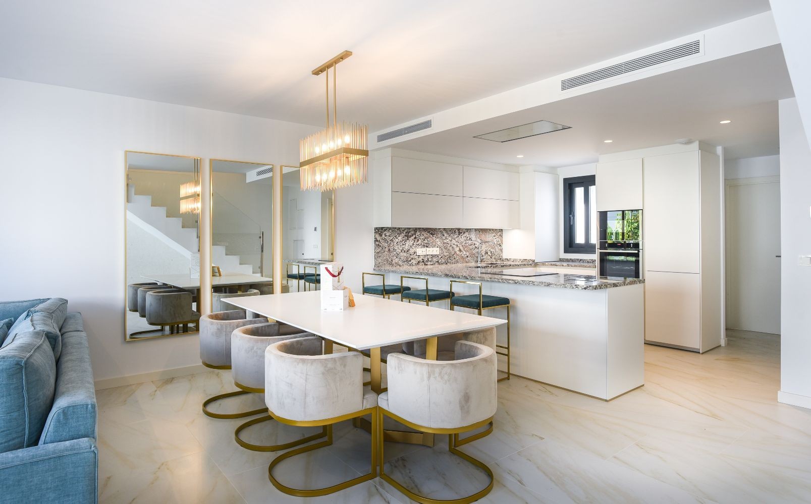 Upon entering, you are greeted by a seamlessly integrated living space that effortlessly combines modern aesthetics with a warm and inviting atmosphere. The open-plan layout accentuates the abundance of natural light, creating a bright and airy ambiance throughout the townhouse.