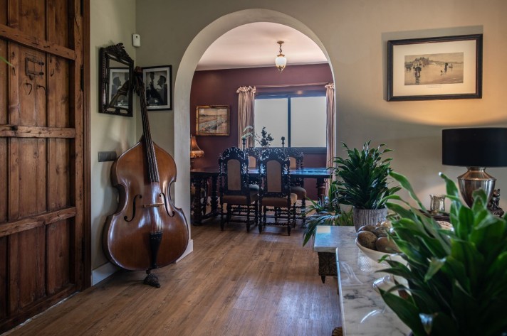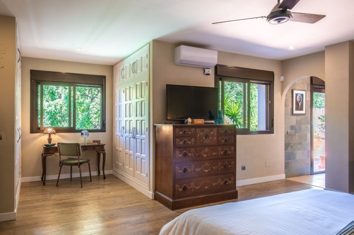 The villa is a contemporary Andalucían style, west-facing, and spans two levels. It features three double-bedroom suites set in the cool overlooking treetops, each with tasteful natural slate mosaic, wood, and glass bathrooms that complement the natural surroundings. The master bedroom suite is exceptionally spacious at 40m², larger than a typical two-bedroom flat in Central London. All bedrooms open onto large terraces, providing privacy and stunning views.
