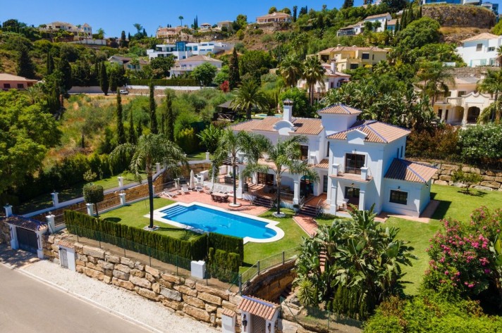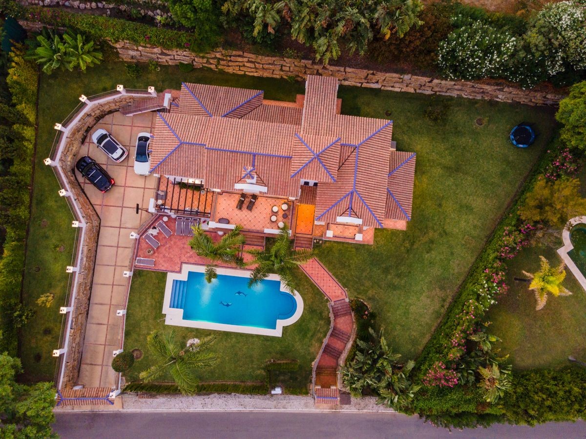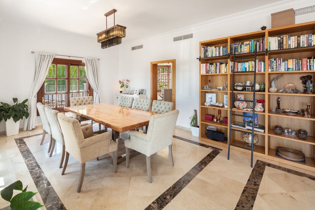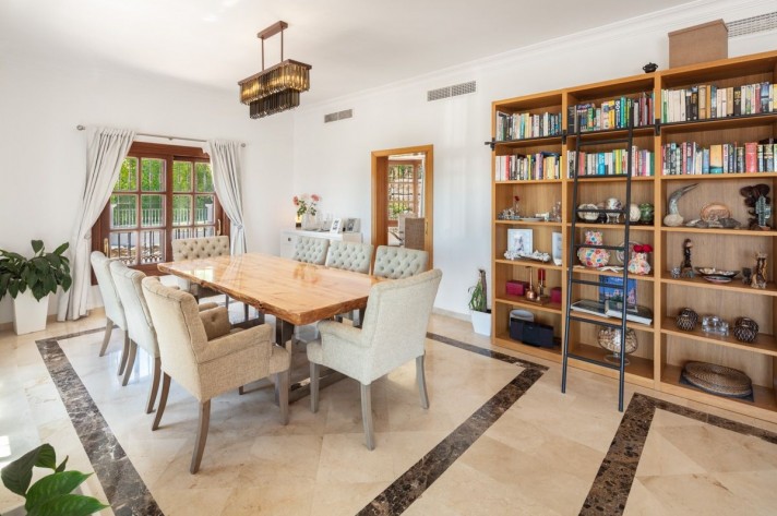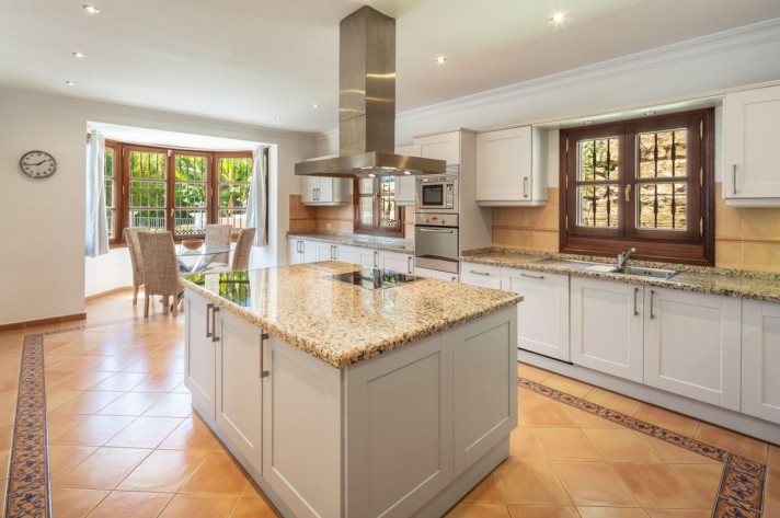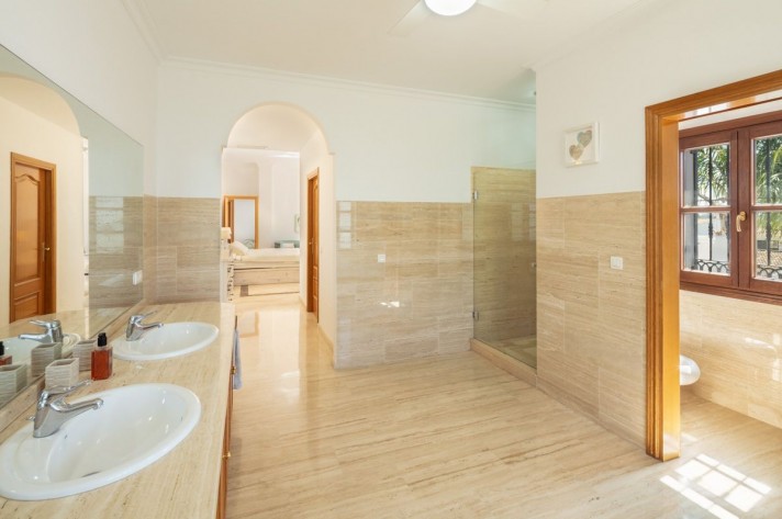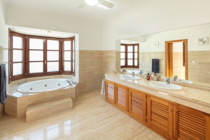The entrance hallway has access to the guest toilet and to the two generous guest bedrooms sharing one bathroom. Terrace access is from the living room and leads down to the pool area beyond. Upstairs, we find the third large guest bedroom with en-suite bathroom featuring a double basin, a full jacuzzi bath as well as a large standalone walk-in shower. The master bedroom suite is a real highlight , being ver y generously sized and featuring a walk-in dressing room as well as a ver y large bathroom with double basin, jacuzzi bath and walk-in shower.