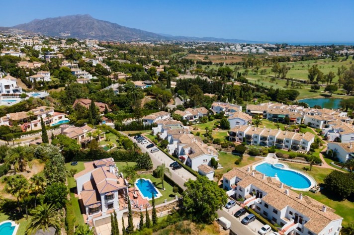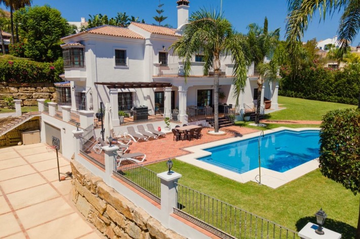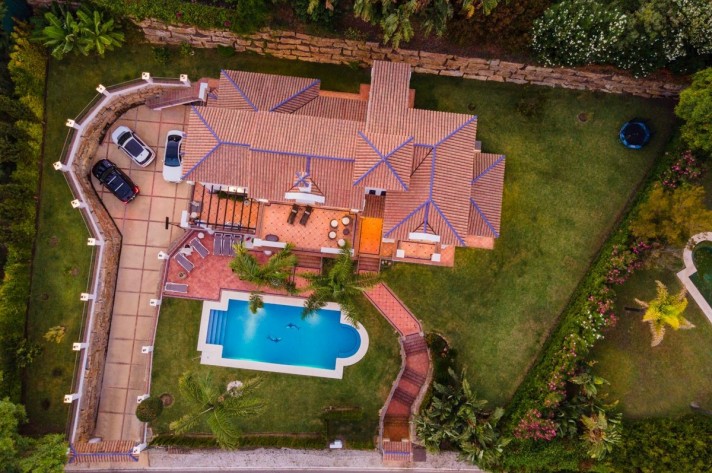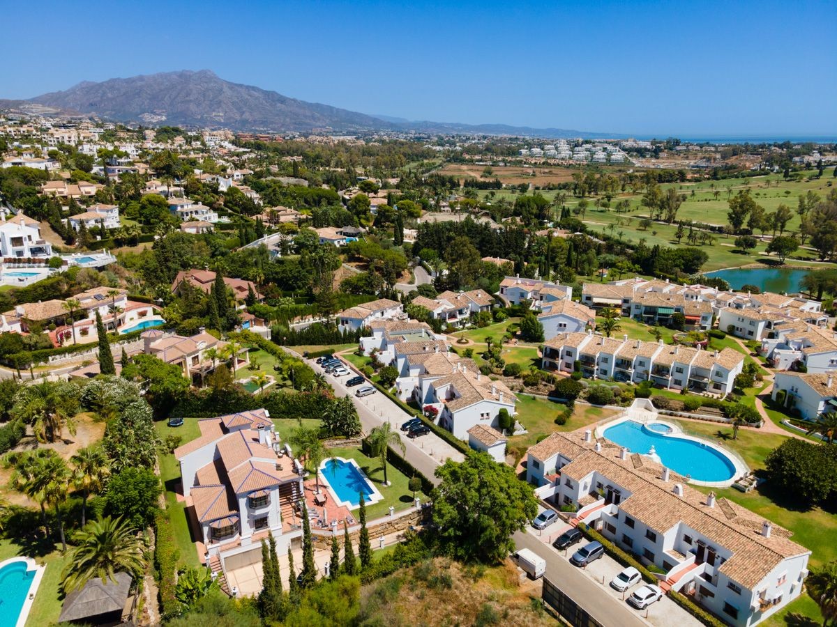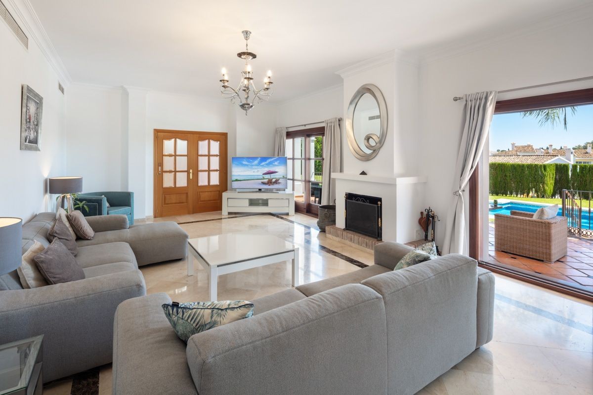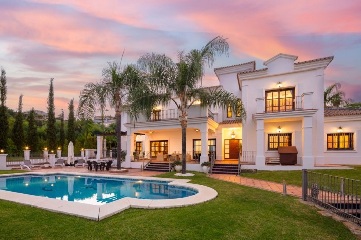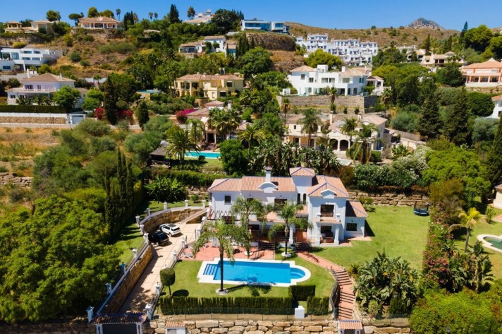 The entrance hallway has access to the guest toilet and to the two generous guest bedrooms sharing one bathroom. Terrace access is from the living room and leads down to the pool area beyond. Upstairs, we find the third large guest bedroom with en-suite bathroom featuring a double basin, a full jacuzzi bath as well as a large standalone walk-in shower. The master bedroom suite is a real highlight , being ver y generously sized and featuring a walk-in dressing room as well as a ver y large bathroom with double basin, jacuzzi bath and walk-in shower.